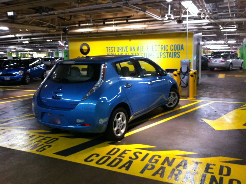 Case in point, this guy. Look at me–I bought a Leaf– the world’s ugliest electric vehicle! And not only am I going to park directly over the sign saying “Coda Parking Only”, I’m going to grab a pizza and eat it in my car while I read “The New Yorker” on my iPad.