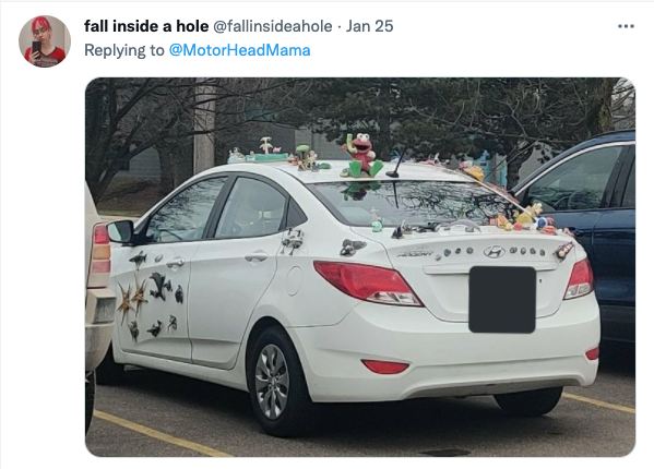 There were several terrifically freaky white car entries, the best of which came from the sordid mind of “fall inside a hole”: