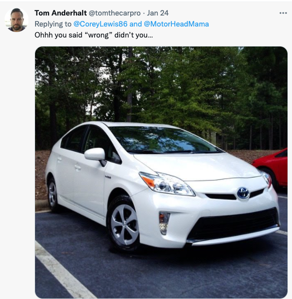 Have you ever been tempted to toss a slab of meat into a tiger cage? Do you like cock fights, MMA, or boxing? Well, if you’re a blood sport fan, I’ve got news for you, Twitter car battles are next-level ferocious. It can be fun to throw some gasoline on that fire, so earlier this week, threw my hat into the ring with this one: