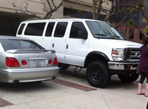 Don’t let its white exterior fool you. This is no ride share vehicle. This van’s been pimped out– all the signs are there, the blacked out windows, the lift, the step (passenger side only, chics in mini skirts need a little extra help)– God knows what’s going on inside.
