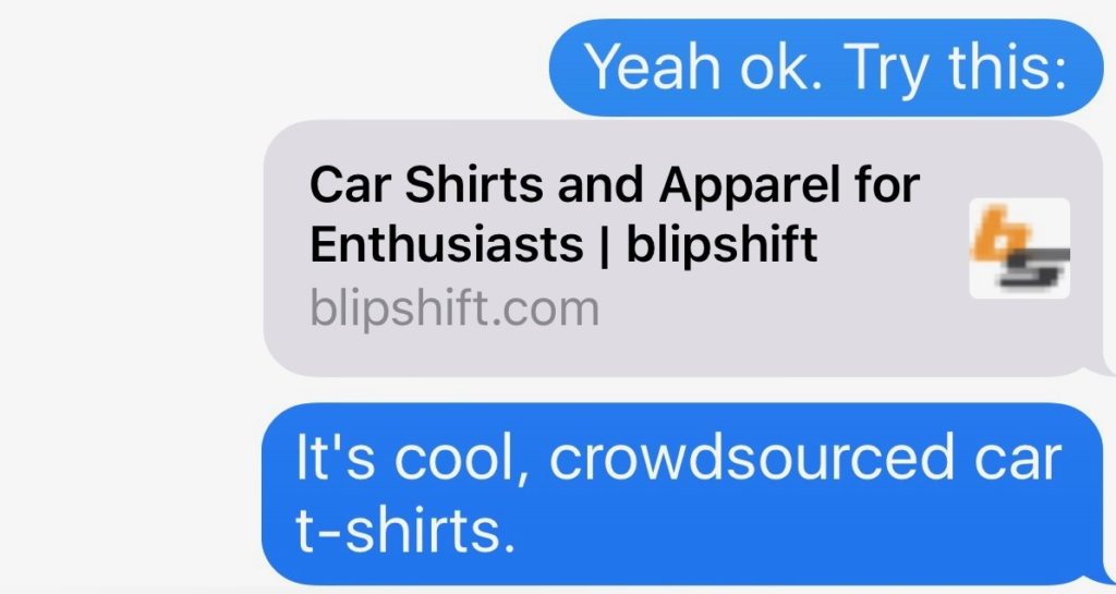 The cool, automotive enthusiast t-shirt, courtesy of Blipshift. Never fails. I’m feeling so good that I decide to get self righteous with my advice: